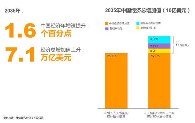 因为人工智能能够带来各行业的智能自动化、提升效率,所以埃森哲跟经济学家对人工智能赋能后的中国经济增长率做了估算。结果显示,如果从现在到2035年,我们用了人工智能,它将会带来平均每年8%的增长,经济总增加值提升约合7.1万亿美元。基于埃森哲的建模分析,结合行业规模数据,我们进一步解读了人工智能对中国15个行业的潜在经济影响, 并发现,制造业、农林渔业、批发和零售业将是利用人工智能获益最多的三个行业,到2035年,其行业总增加值的年增速将分别提高2%、1.8%和1.7%。