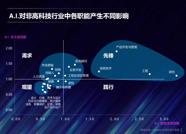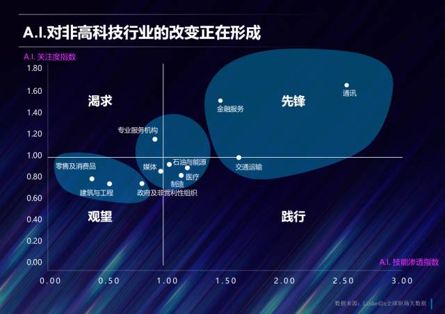 王迪表示,通过领英的数据,我们可以直观的看到,像金融服务、通讯、交通运输这样“先锋性”的行业,应用度很高,但是关注度略低,这表明他们已经开始低调地应用AI技术了;而像左上角的“渴求”,则表示对AI关注度很高,但还没有具体应用,像法律等行业。