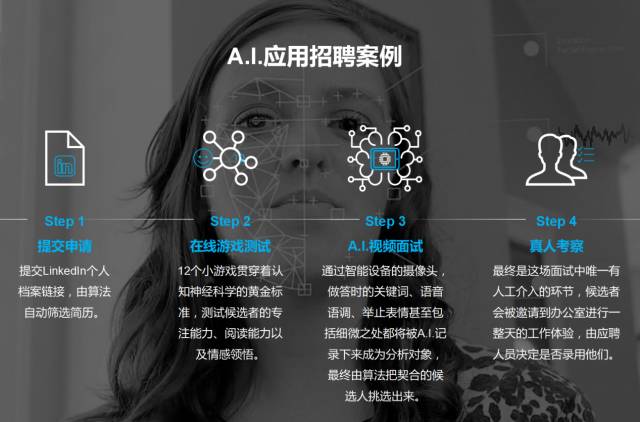 “首先,让候选人在线提交他的个人简历。第二步,有一个AI程序在背后对简历做初步的筛选,看他和招聘之间是不是有初步的符合,明显不靠谱的就过滤掉了。经过这个之后,会给进入到下一轮的候选人发一个邮件,会有在线游戏测试,有12项小游戏,但是这些游戏的设计是有目的的,有些目标是看候选人的一些基本的沟通能力、数学技能、逻辑能力、情感能力等等,完成这个游戏测试之后,背后的AI机器再次做出筛选”。
