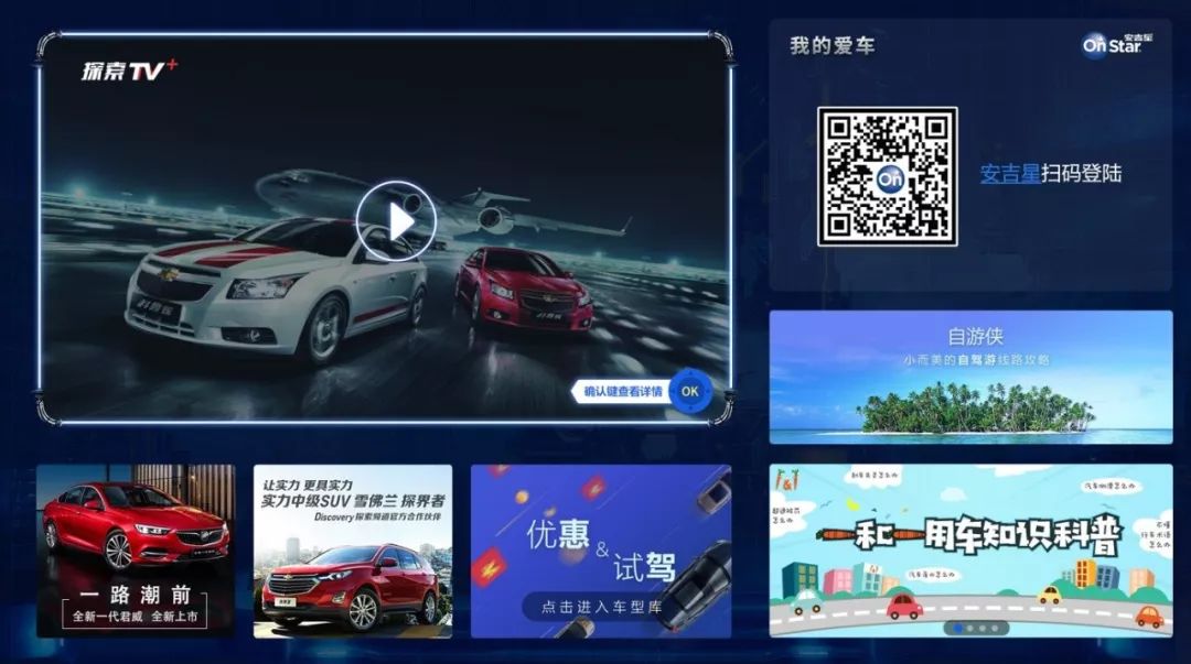 如上图所示,这个是探索传媒定制的汽车频道主页。其中,左半部分主要还是以广告为主,如新车展示视频、新车推介图和车型库;而右半部分则完全是以用户需求为主而特别设置的服务内容,它们分别是安吉星、自游侠和用车知识科普视频。安吉星可以实时了解用户爱车的各种数据,自游侠版块只需要用户输入所在地即可为用户推荐丰富多彩的自驾游线路,而用车知识科普视频则可通过通俗易懂的视频为用户普及和提升各种驾驶技能。