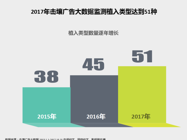 击壤大数据显示,植入的方式从2015到2017呈明显的增长趋势,2015年38种,2016年45种,2017年51种,各种富有创意的植入类型不断涌现。