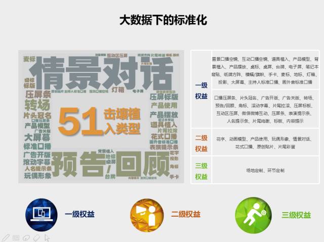 就像运用大数据对冠名、特约和指定产品的效果评估。其中,冠名的标准是从头到尾用超出平均值22种的植入类型对产品曝光,而特约的曝光时长和植入类型明显大幅度下降,钱花的不少但曝光效果不及冠名商的一半,而指定产品则是针对产品使用场景做配套合作,曝光场景和时长会更少,广告主可以直观地对比合作权益在大数据下是否达到标准。